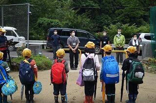 演習林施設から学校へみんなで登校です。さあ、今日も