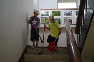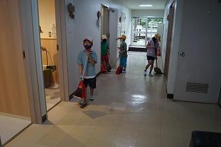 活動の仕上げは、施設の清掃です。2日間お世話になった施設を