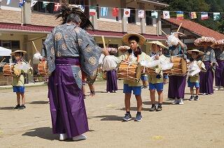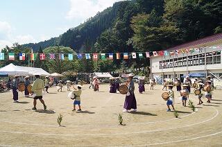 地域の指導者の方へ来ていただいて、臼太鼓踊りの練習も
