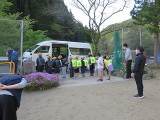 大河内小の朝は、スクールバスの到着とともに始まります。徒歩通学の子も一緒にバスを迎えます。