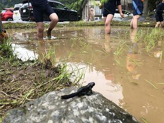 みんなの田植えの様子を、石の上からイモリが眺めていました。