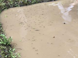 植え進めていくと、アメンボたちがだんだんと田んぼの隅に寄り集まっていました。