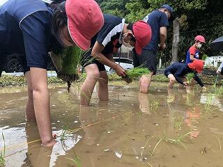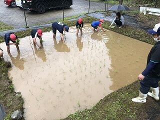 田植え綱を先生たちが引っ張って、保護者の方にアドバイスをもらいながら植えました。