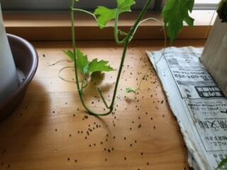 休み明けの朝、1・2年生教室に置いていたゴーヤの苗の下に