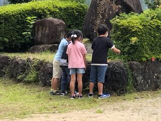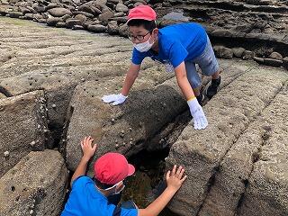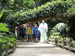 青島神社を見学。奥の宮まで行きました。ジャングルでした。そして鬼の洗濯岩で磯遊び。カニを見つけて大興奮。