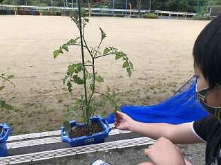 「ミニトマトの毛がねこの毛みたいなさわりごこちでした。ミニトマトのはっぱのつめたさがこおりみたいでした。」
