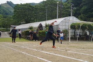 ボール投げの測定。日頃のサーキットトレーニングの成果が表れたいいフォームです。