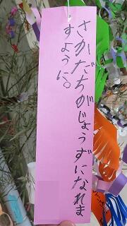保護者の方が切り出してくださった笹竹に、七夕飾りをつけました。背の高い竹なので、朝礼台にのってつけました。
