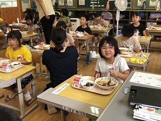 5年生のお兄さんの「さみしいから、給食は1・2年生と一緒に食べたいです。」という提案で、一緒に食べることにしました。