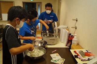 夕食作りスタート!メニューはカレーライス。調理実習を経験している5・6年生が、切って炒めます。