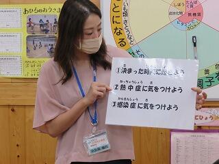 熱中症予防について、子どもが自分自身で気をつけることの確認をしました。