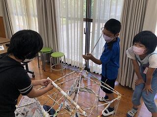 4年生は図工。ほかの学校の子たちと協力しながら、ちらしを使って「家」をつくります。