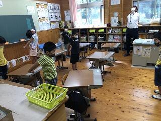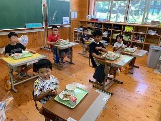 5年生のお兄さんの「さみしいから、給食は1・2年生と一緒に食べたいです。」という提案で、一緒に食べることにしました。
