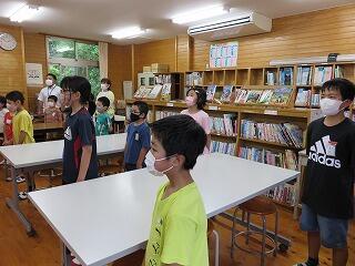 1学期の終業式。体育館は蜂の心配があったので、急きょ図書室に変更しました。
