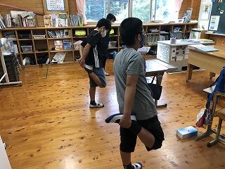 CDの音楽と指示に合わせて運動します。CDに入っている運動の指示をする声は、大河内小の卒業生です。やさしい先輩のことを思い出しながら、気持ちよく運動できます。