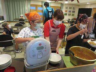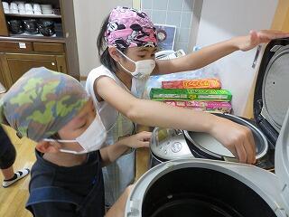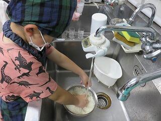 3・4年生はご飯を炊きます。2升炊くので、お米をとぐのもたいへんです。
