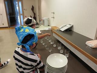 1・2年生はスプーンやコップを並べます。数が合っているか、何度も確かめています。やる気マンマンです。