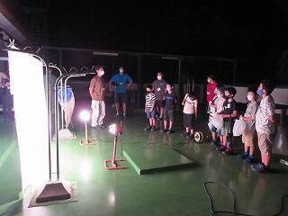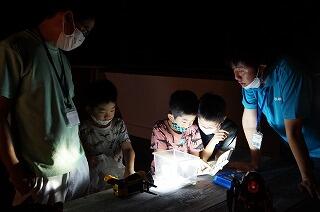 夕食の後は、1日目のメインの活動「ライトトラップ」です。白布に明かりを当てて虫を集めます。
