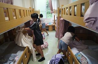 1日目。まずはベッドメイキング。1年生も自力でがんばります。