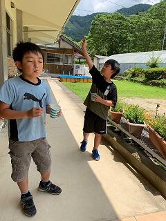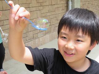 1・2年生がシャボン玉を飛ばして楽しんでいました。シャボン液もストローも手作りです。