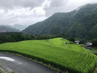仙人の棚田。対岸の山にある展望台から見る景色もすばらしいそうです。ここまで水を引いてきた先人の努力に、さらにテンションが上がります。