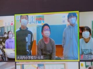 椎葉村5校の5・6年生と宮大附属小6年生3クラスが集まる全体会は、画面越しでも壮観でした。
