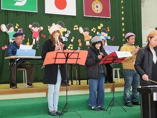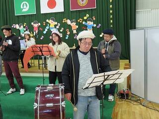 子どもたちに負けじと、家庭教育学級生「ママーズ&おやじーズ」による「明日があるさ」の合奏です。仕事の合間をぬって練習を積み重ねてこられました。写真で見ると表情はカチコチですが、演奏はバッチリ大成功でした。