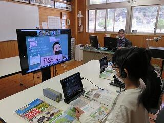 授業をしているのは、画面の向こうの松尾小学校の先生です。
