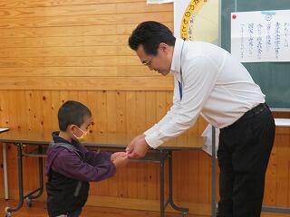 教頭先生の話の後に、1年生にJRCのバッジが渡されました。上級生と一緒に活動しながら、1年生も、気づき、考え、実行する態度をだんだんと身につけていきます。