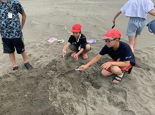 宿泊学習2日目の午後は、「砂の造形」をしました。広くてきれいな砂浜を、思う存分、掘り、運び、積み上げました。
