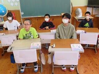 先生が5年生と学習をしている間、6年生は自分たちで学習を進めます。2人で地図帳の地名探しをした後は、タブレットパソコンで、AIが採点してくれるドリル学習に取り組みました。手書きした文字をAIが認識して採点してくれます。時代は進んでいますね!