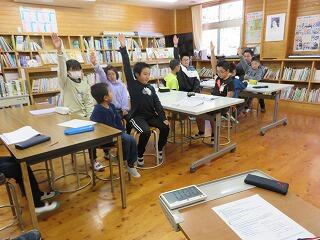 全校での話合いの時間「ミーティングタイム」。1年生から6年生まで、いつものように熱心な意見交換です。