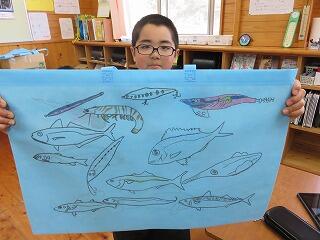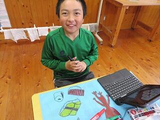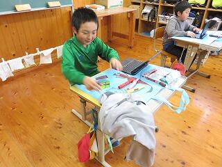 放課後のバスを待つまでの時間です。3・4年生教室をのぞいてみると、「作品バッグ」に絵を描いていました。