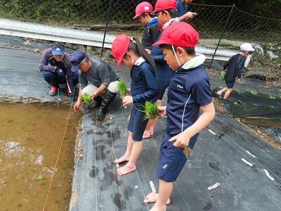 一年生にとっては初めての田植えとなりました。指導のT様や先生方のアドバイスを聞きながら、丁寧に植えていきました。