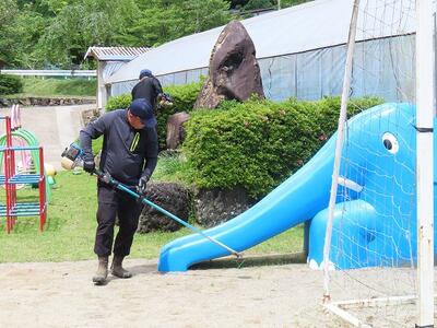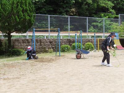 最後は午後の奉仕作業です。保護者や先生方で草刈りや運動場の除草作業をしていただきました。