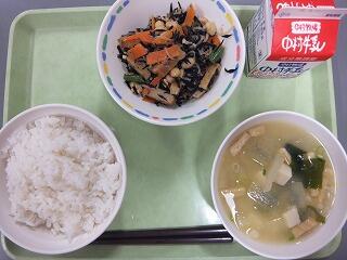 麦ごはん 大豆とひじきの炒め煮 冬瓜のみそ汁