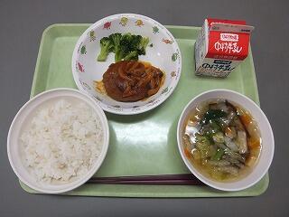 麦ごはん 五目スープ 煮込みハンバーグ 添えブロッコリー