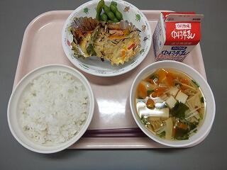 麦ごはん わかたけ汁 魚のみそマヨネーズ焼き 枝豆