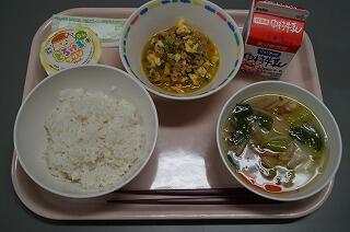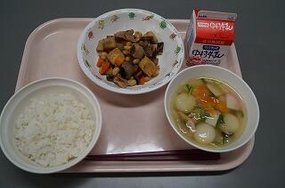 麦ごはん きのこのスープ 厚揚げの中華煮