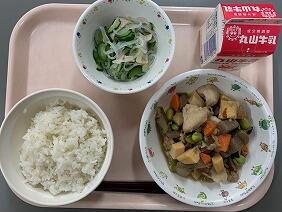 今日のサラダはいつもとは少し違う、さっぱりした甘酸っぱい味です。昆布やチーズが入っていて、栄養たっぷりで元気が出ました。煮物は、高野豆腐から出汁がじゅわッと出て、食べ応えがありました。里芋もホクホクで、ご飯が進みました。