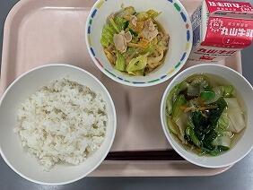 麦ごはん 鮭塩焼き 小松菜のたくあん炒め 栄養すいとん