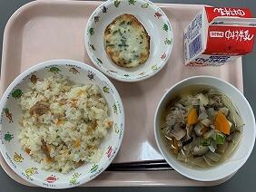 ゆかり和えは、キュウリの食感がよく梅がさっぱりしていて、箸休めにピッタリでした。白身魚の甘辛揚げは、表面がカリッとしていて、甘辛い味付けでご飯が進みました。コロコロしていて、低学年の児童も食べやすそうでした。鶏ごぼう汁は、鶏の出汁がよくでていて、具だくさんでおいしかったです。