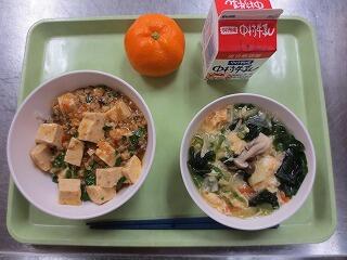 低学年にとっては、ちょっとピリ辛のマーボー丼でしたが、みんなもりもり食べていました。デザートのみかんも甘くておいしかったようです。