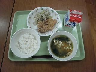 麦ご飯 ・ じゃがいものみそ汁 ・ 鶏のからあげ ・ ゆかりあえ