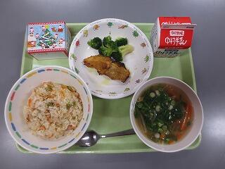 今日は、2学期最後の給食でした。今日の献立は、子どもたちが大好きなピラフにチキンにケーキ!とっても大喜びの子どもたちでした。ケーキは、自分たちで選んだものでした。