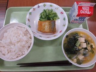 麦ごはん ・ かぼちゃのみそ汁 ・ 魚のカレー揚げ ・ 添えきゅうり