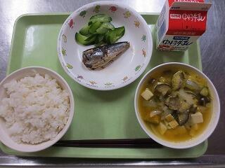 麦ごはん ・ 夏野菜の味噌汁 ・ いわしのしょうが焼き ・ 添えきゅうり