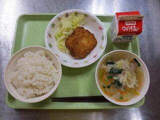 麦ごはん ・ 白身魚のフライ ・ 添えキャベツ ・ 肉団子のスープ