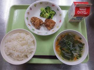 麦ごはん ・ わかめスープ ・ 鶏のから揚げ ・ ブロッコリー