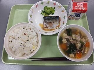 さつまいもごはん さばゆずみそ煮 添えきゅうり 五目汁